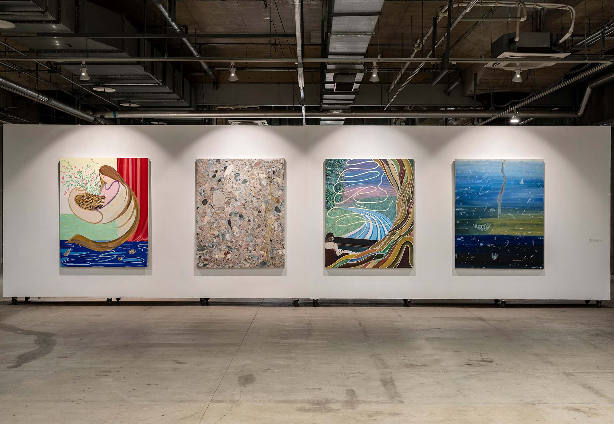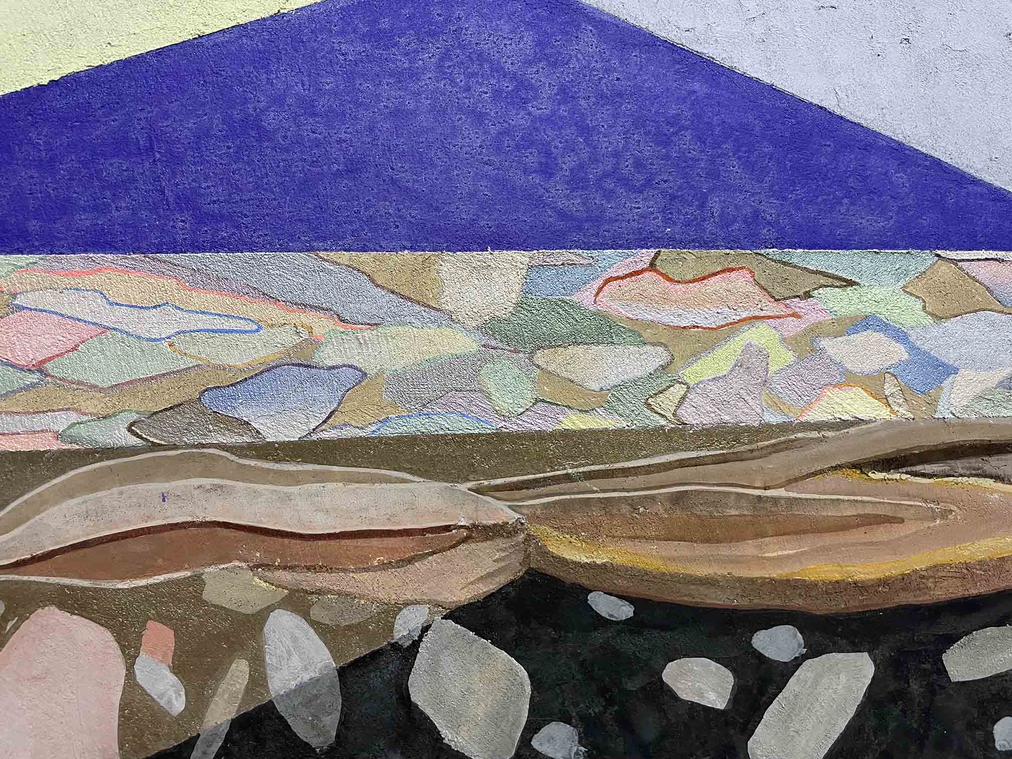 複数のパネル、発泡スチロール、流木、工業塗料、顔料、アクリル樹脂