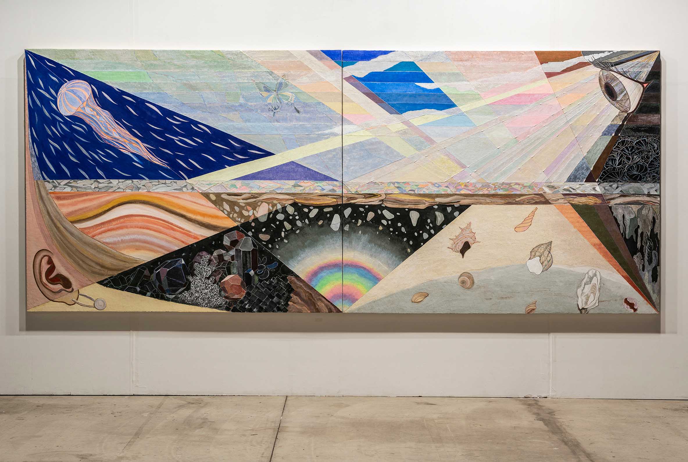 Multiple panels,polystyrene foam, drift wood, industrial paint, umbrella, vinyl tape,pigment and acrylic resin